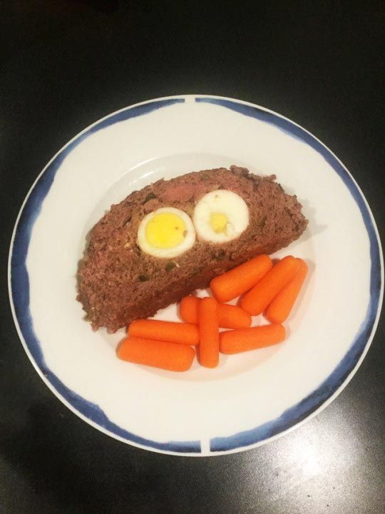I came to this article after reading The Harpo House Rules. My first reflection: Hard-boiled eggs? >honk!< Eggs as a binder for the loaf, sure, but as a garnish or hidden treasure? No, a gimmick, at best.