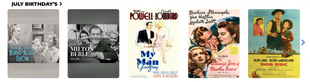In celebration of July Birthdays, we’re featuring Gracie Allen, Milton Berle, William Powell, Barbara Stanwyck, Olivia de Havilland, Charles Laughton, James Cagney and Harriet Hilliard Nelson.