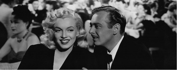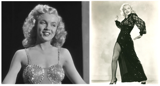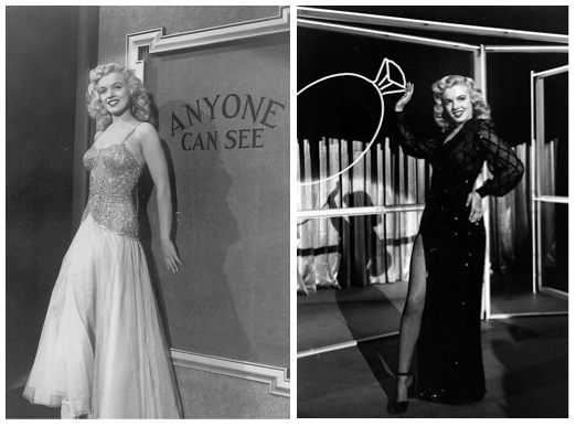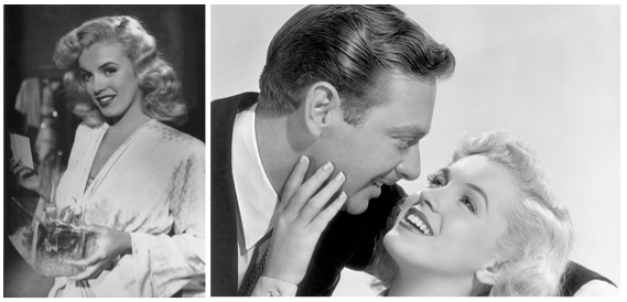 Monroe performed three songs by Allan Roberts and Lester Lee with choreography by Jack Boyle. As part of a chorus, she sings “Ladies of the Chorus” in the film’s opening and breaks out in the solo, “Anyone Can See I Love You,” on the burlesque stage and in a reprise montage with Brooks. Finally, in “Every Baby Needs a Da-Da-Daddy,” Monroe foreshadows her Beatnik-inspired “My Heart Belong to Daddy” number in Let’s Make Love (1960). In the last number, she steps out of a giant picture album in a flowing gown of virginal white chiffon with a tight, spangled bodice. Poised and graceful, Monroe glows with promise as a future musical comedy queen.