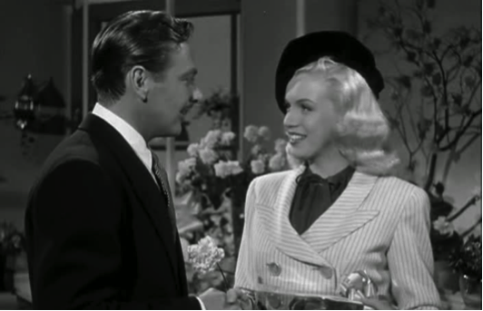 Monroe’s debut as a musical comedy performer in Ladies of the Chorus was arguably far from dreadful. In the succinct, B-movie with a ten-day production schedule, she portrayed Peggy Martin, a burlesque chorus dancer with an overprotective mother, May (Adele Jergens), another dancer in the troupe. When headliner Bubbles LaRue quits, the stage manager asks May to take her place, but she concedes to her daughter. Peggy’s performance is classy, and the audience is smitten by her. Randy Carroll (Rand Brooks), a wealthy young man in the audience, is especially smitten and anonymously sends Peggy orchids by the dozens. When a florist, unaware of Peggy’s identity, disapproves of Randy sending orchids to a burlesque star, Peggy plays along with a sneer. Peggy and Randy begin dating, and Randy quickly proposes.