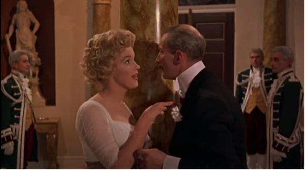 Monroe shines in a charming scene during which Elsie serves herself from the buffet while the prince takes an urgent telephone call, a masterpiece of improvisation. Bored with the evening, she begins talking to herself and drinking champagne, slowly becoming intoxicated. Monroe was required to eat caviar and chicken salad in the multiple takes, so Olivier suggested she mime eating. Monroe insisted on the reality of consuming the food but requested apple juice as a substitute for champagne. Elaine Schreyeck, responsible for script continuity, assisted Monroe in directing the scene while Olivier acted in the background. Once again, Monroe stole the scene from Olivier.