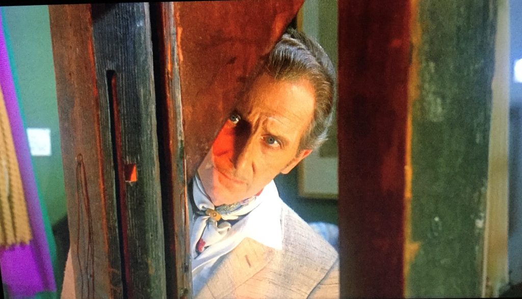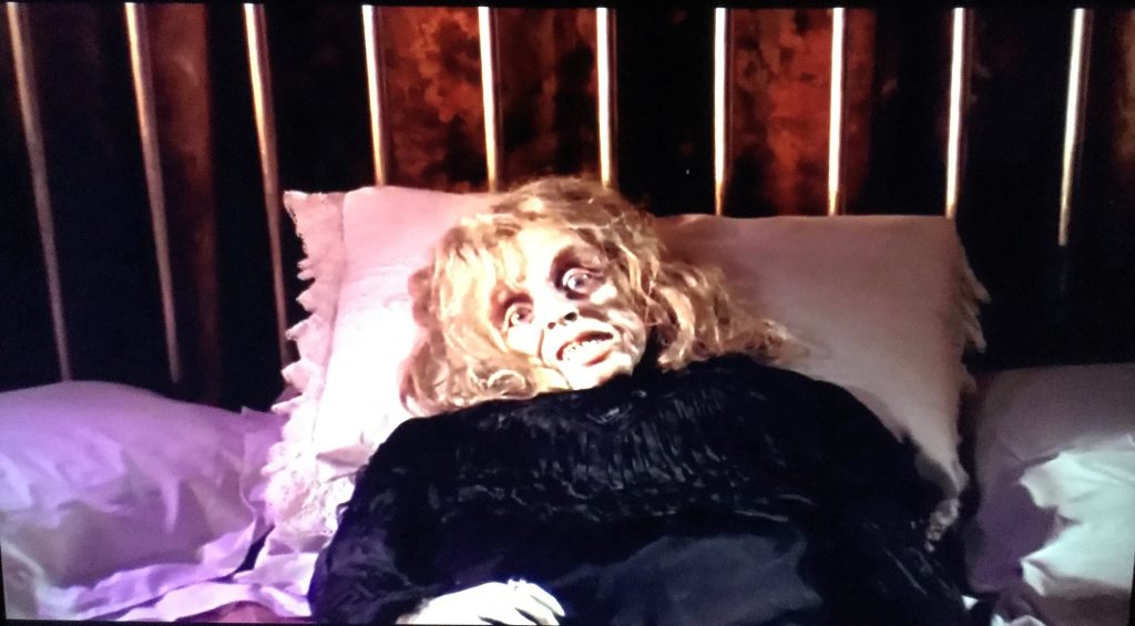 In The Cloak, we meet that missing actor (played by Jon Pertwee, the Third Doctor in Doctor Who), who buys an “authentic” vampire cloak to add realism in his film (Curse of the Blood Suckers). Unfortunately, it’s a bit too realistic. Ingrid Pitt (and her cleavage), looking like she just stepped out of a Hammer film, plays his co-star and love. It’s campy fun and a love letter to horror fans with nods to Shepperton Studios (where this movie was made). The estate agent’s address is Hynde Street Bray, which I’ll take as a reference to Hammer’s Bray Studios and screenwriter and producer Anthony Hinds.