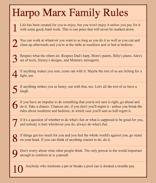 So today, in honor of Harpo Marx’s birthday (born over 130 years ago today, on Nov. 23, in 1888), I’d like to share the Marx Brothers Family Rules, which are posted on Harpo’s Place, the Official Arthur Harpo Marx Family Online Collection, curated by Harpo’s son Bill Marx.