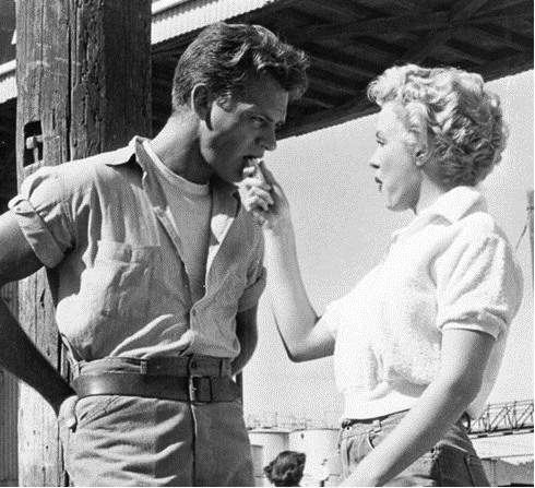 From the moment Monroe appears on screen in a pair of jeans and a sweater, it is clear she is playing a strong girl, the strongest of her career, who is exploring the limited options for a woman in the 1950s. When Joe meets Peggy outside the cannery after work as she eats a candy bar, he warns, “You’ll spread.” Without vanity, she affirms the possibility and changes the subject to a coworker who was recently beaten by her husband. Joe justifies the man’s behavior based upon his role of husband. Peggy snaps back that he might beat her, too, if they were married. Joe tries to kiss her, and the couple playfully scraps. “When I want you to kiss me,” Peggy says while kicking his shins, “I’ll let you know…by special messenger.”