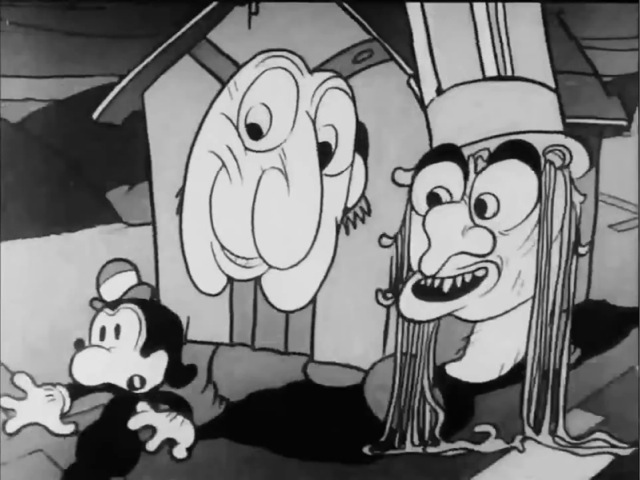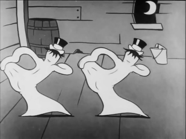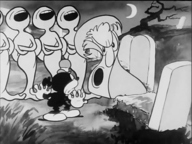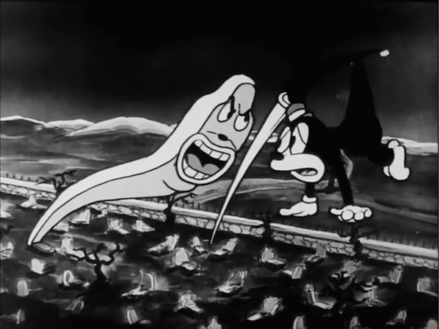 (By the way, at 3:32 the stereotypical bowler-hatted Jewish ghost in the graveyard who splays out both hands in front of Bimbo the thief and shrugs “You needed it?” in reference to the imminent loss of Bimbo’s soul is a reference to the famous dialect comedian Monroe Silver, who had a long career in vaudeville and as a comic recording artist, actually recording sides as Casey and Cohen with the voice of Bimbo (and all around Fleischer utility voice-over guy) Billy Murray.
