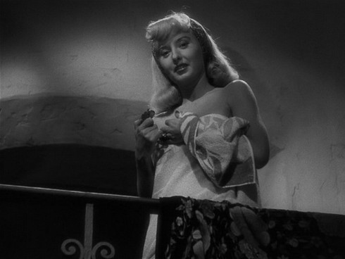 1) Phyllis’s entrance. We first meet Phyllis when insurance salesman Walter Neff (Fred MacMurray) shows up at her house in an attempt to secure an auto insurance renewal. While Walter is at the door gabbing with the maid, Phyllis appears at the top of the stairs, clad only in a towel, having just emerged from a sunbath. After only a few seconds in her presence, Walter’s tongue is practically hanging out of his mouth. He can barely keep an appreciative smile from curving his lips, or stop cracking lame, suggestive jokes. And when Phyllis exits stage left to slip into something a little less comfortable, we learn what a powerful impact Phyllis has made on him: “I was thinking about that dame upstairs and the way she had looked at me. And I wanted to see her again. Close. Without that silly staircase between us.”