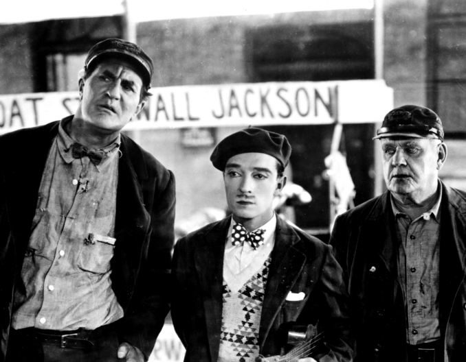 If the flapper had an iconic style, so did these teenaged and college-aged sheiks. Oxford bags (wide-legged trousers) became very popular, especially on college campuses, and many young men also favored loud-patterned sweater vests and sporty straw hats. Carrying a ukelele was a bonus, and spending time at a college game wasn’t complete without wearing a raccoon coat. Buster Keaton and Harold Lloyd would take notice of the new trends, lampooning them in Steamboat Bill Jr. (1928) and The Freshman (1925).