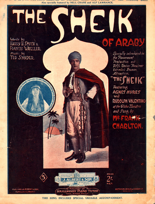 The “sheik” phenomenon also coincided with the public’s interest in “Orientalism,” as it was called, which had been strong since the 1910s. The Far East, particularly the desert, was considered a place of mystery and beauty where passions could still run wild. Trend-setters enjoyed decorating with lacquered tables and dressing in Eastern-inspired clothing, perhaps seeking some escapism. Certainly, the romantic “sheik” was one of the prime escapist figures of the 1920s, showing up in artwork, comic strips, ads, and songs like the popular The Sheik of Araby.