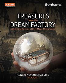 Bonhams and TCM are proud to announce their third annual movie memorabilia auction, Treasures from the Dream Factory, to be held in New York on November 23. Following on the success of the 2013 and 2014 auctions-where the Maltese Falcon sold for $4.2 million and Sam's piano from Rick's Café in Casablanca sold for $3.2 million-this year's auction features such high points as the dress worn by Judy Garland in The Wizard of Oz, a selection of screen-worn gowns of Marilyn Monroe, and Herman Mankiewicz's personal Rosebud sled.
