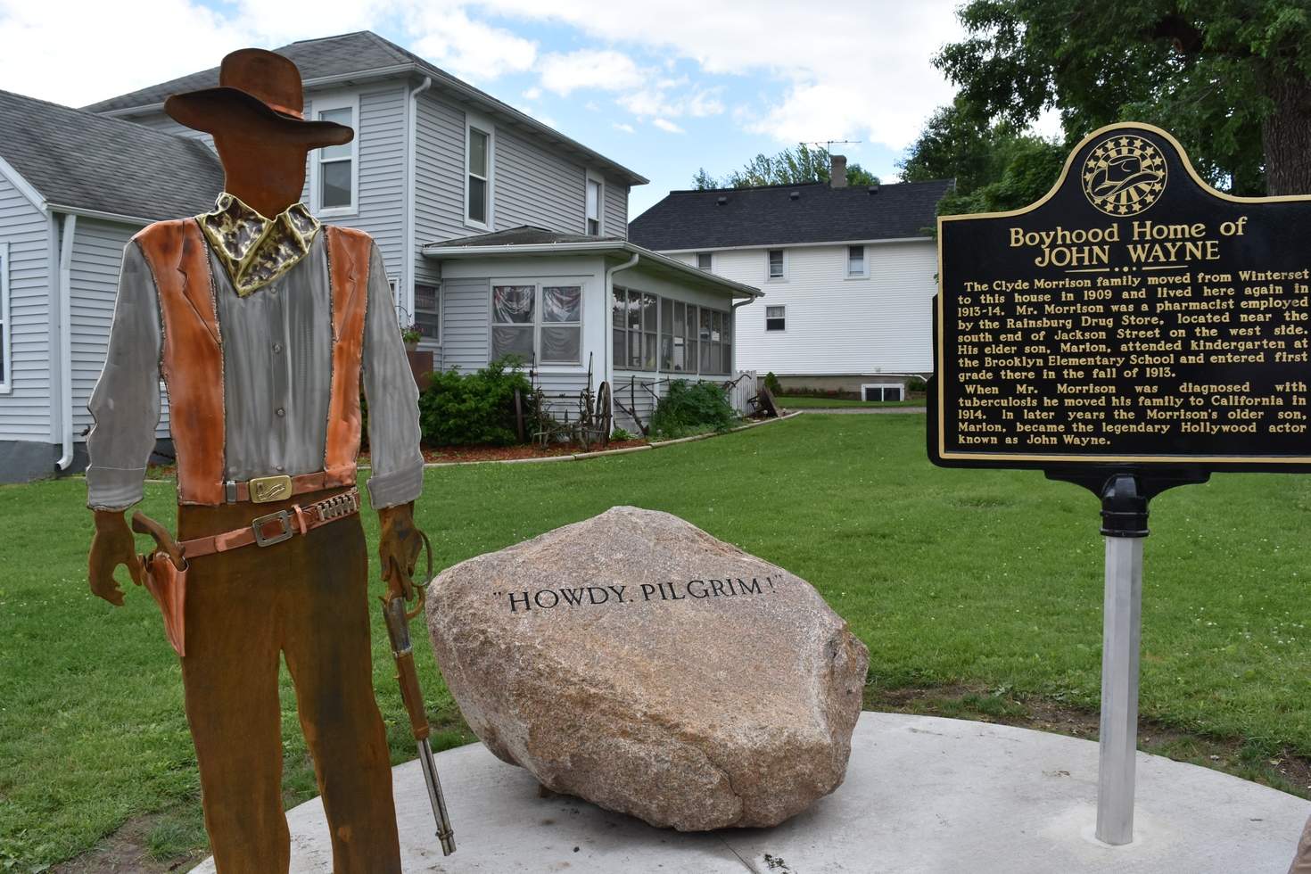 Over the past year and a half, four people from the Brooklyn Historical Society raised more than $10,000 for a commemorative plaque, John Wayne silhouette and a rock with the saying "Howdy Pilgrim!" to place outside Wayne's former home.