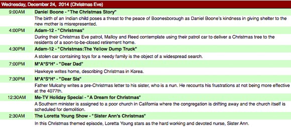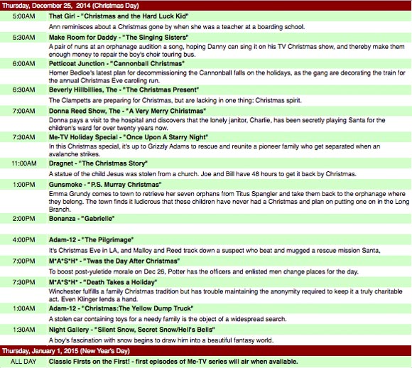 MeTV Network's classic programming specials for the Holiday Season include classic TV Christmas episodes from Adam-12, M*A*S*H, That Girl, Petticoat Junction, The Donna Reed Show and more -- plus classic first episodes on New Year's Day.